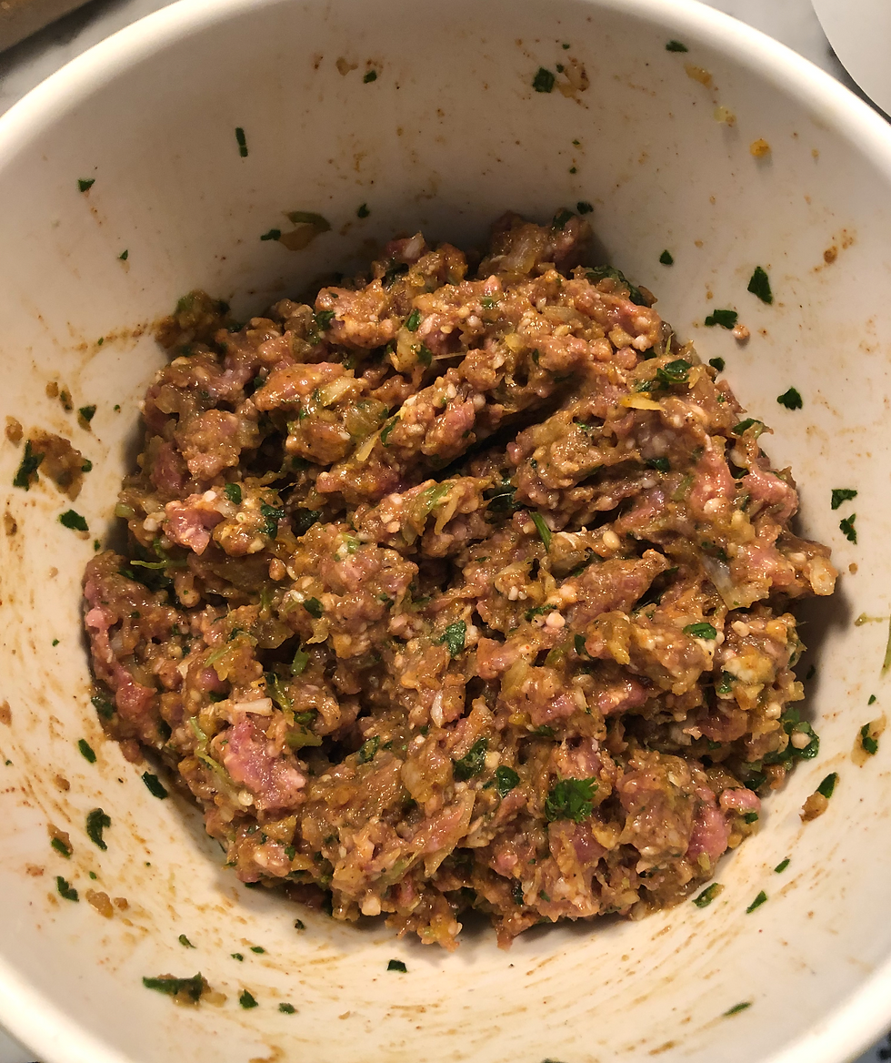 Continue to add the rest of the ingredients! Add 1 egg and then the rest of the spices, salt and pepper. I like strong flavor but if you are not a big fan of "in your face" big flavors, simply cut all the spices in half. And then start mixing everything in. Regardless of what you do, just make sure you mix your meat in one direction, I like to do it clockwise. I am not sure why but that's what my mom told me so I assume it's some kind of old Asian wisdom. After you are done, it should look like this: